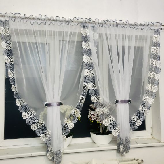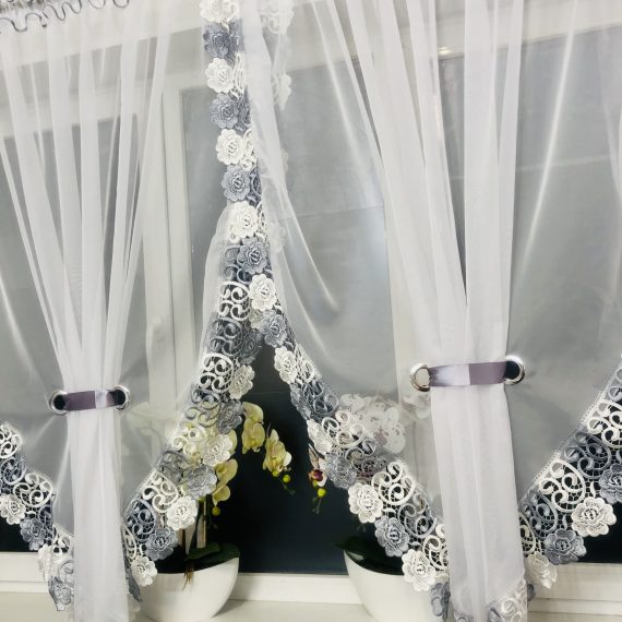 Elegancka mała firana markizeta z szara gipiurą