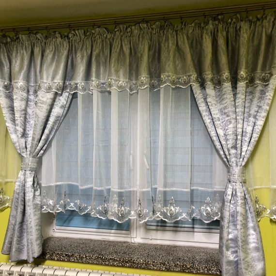 Komplet firana dekoracja z modnym haftem gipiurą – szara