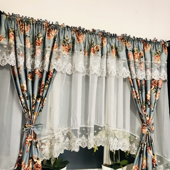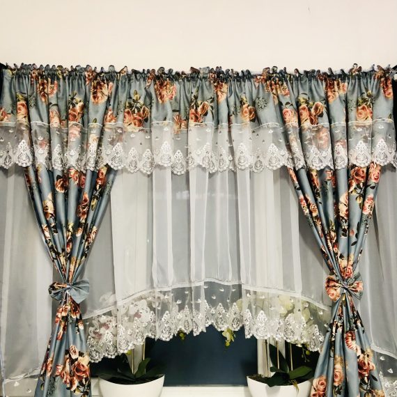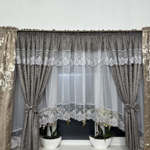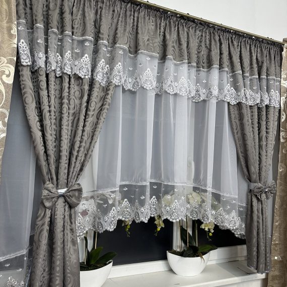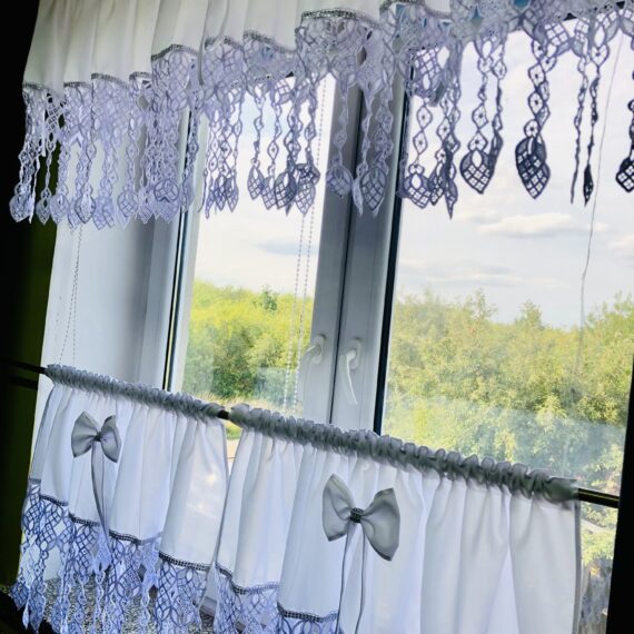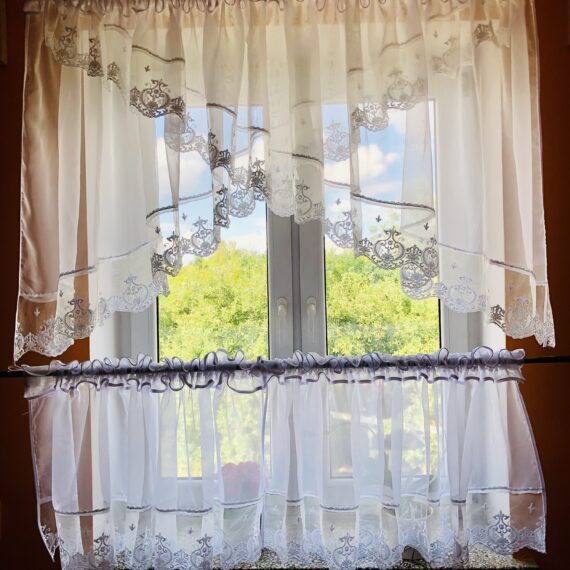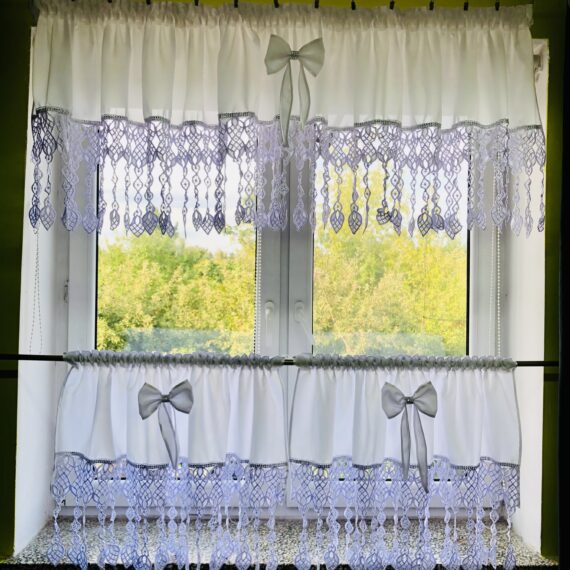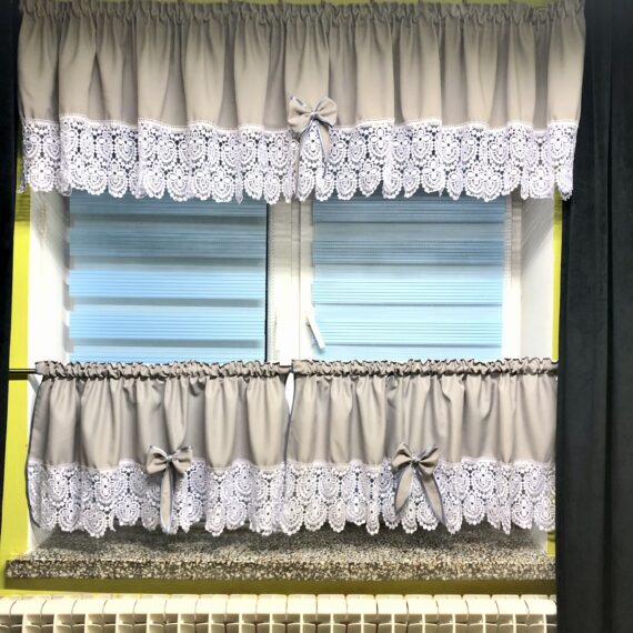 Komplet firana dekoracja z modnym haftem gipiurą – szara