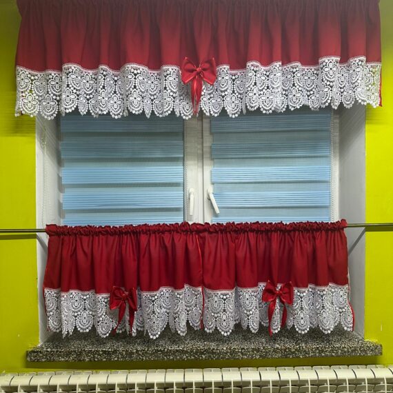 Komplet firana dekoracja z modnym haftem gipiurą z karo wzór – bordowa