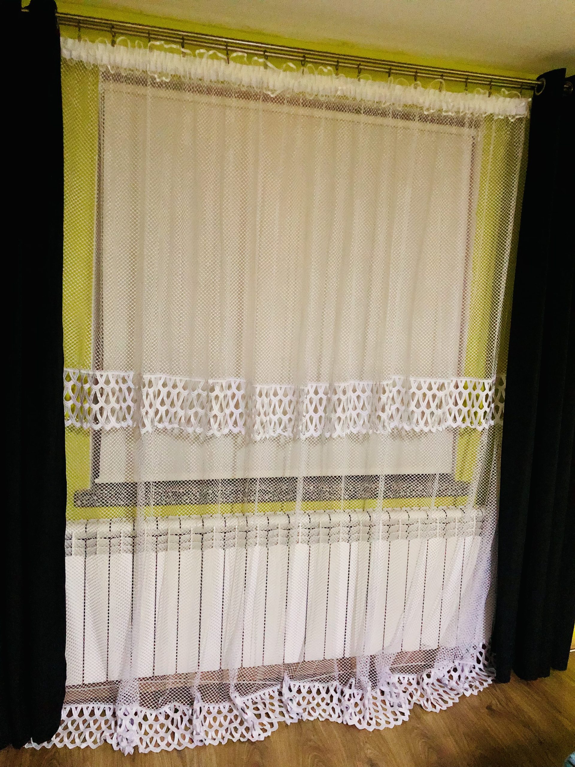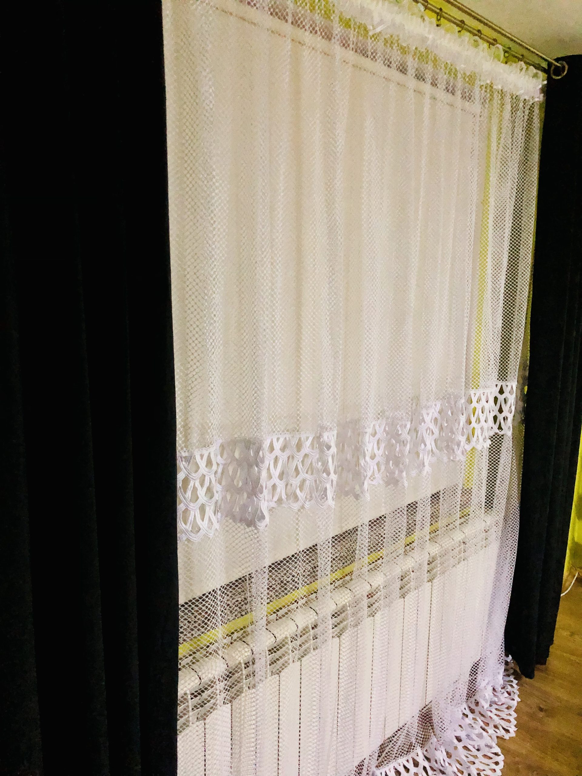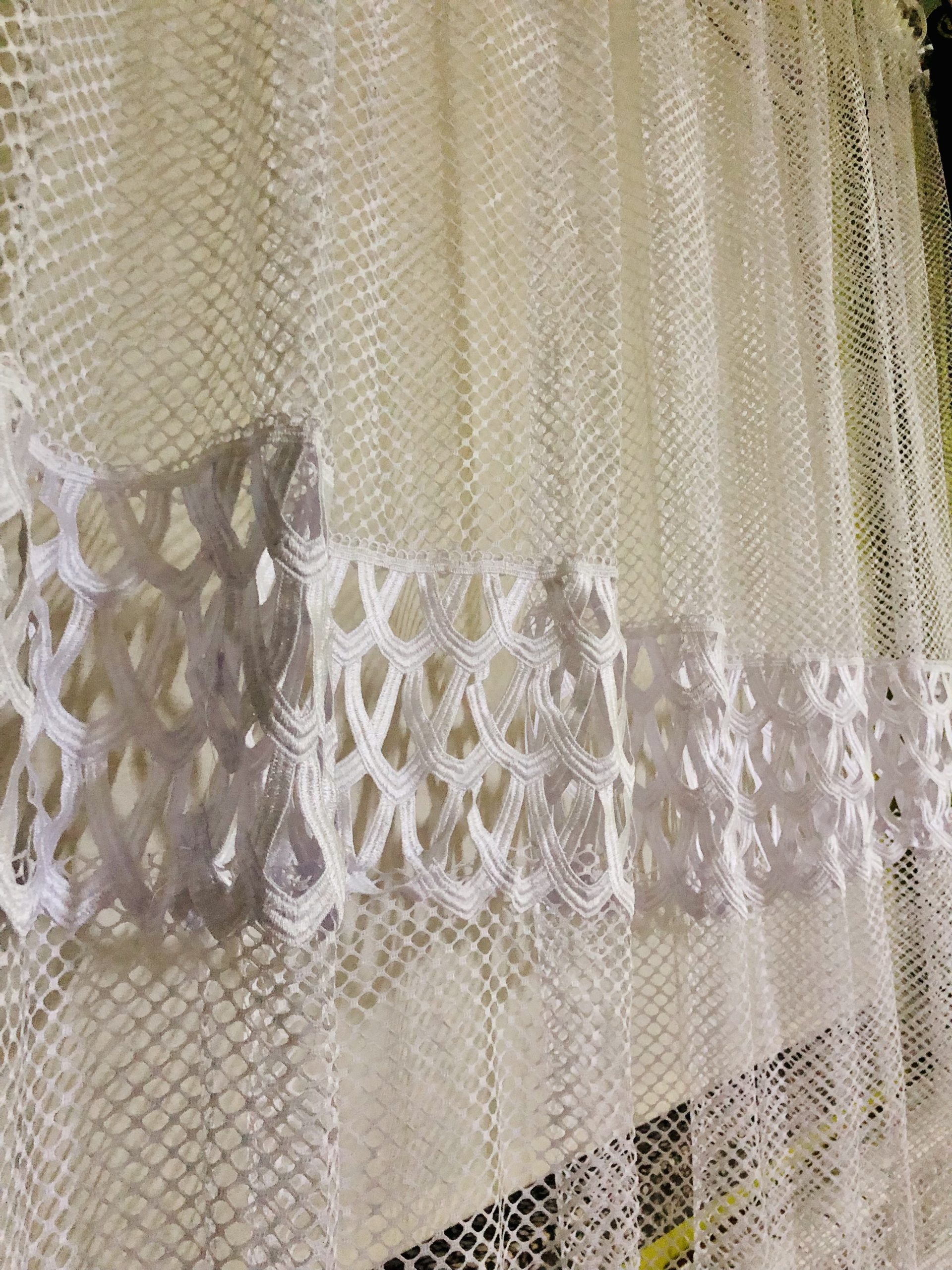 Firana z białego żakardu imitującego plaster miodu z doszytą gęstą, koronkową gipiurą . Grubo tkana struktura firany przypomina robioną na szydełku. Pięknie się układa,a śnieżnobiała, koronkowa gipiura dodaje jej elegancji.