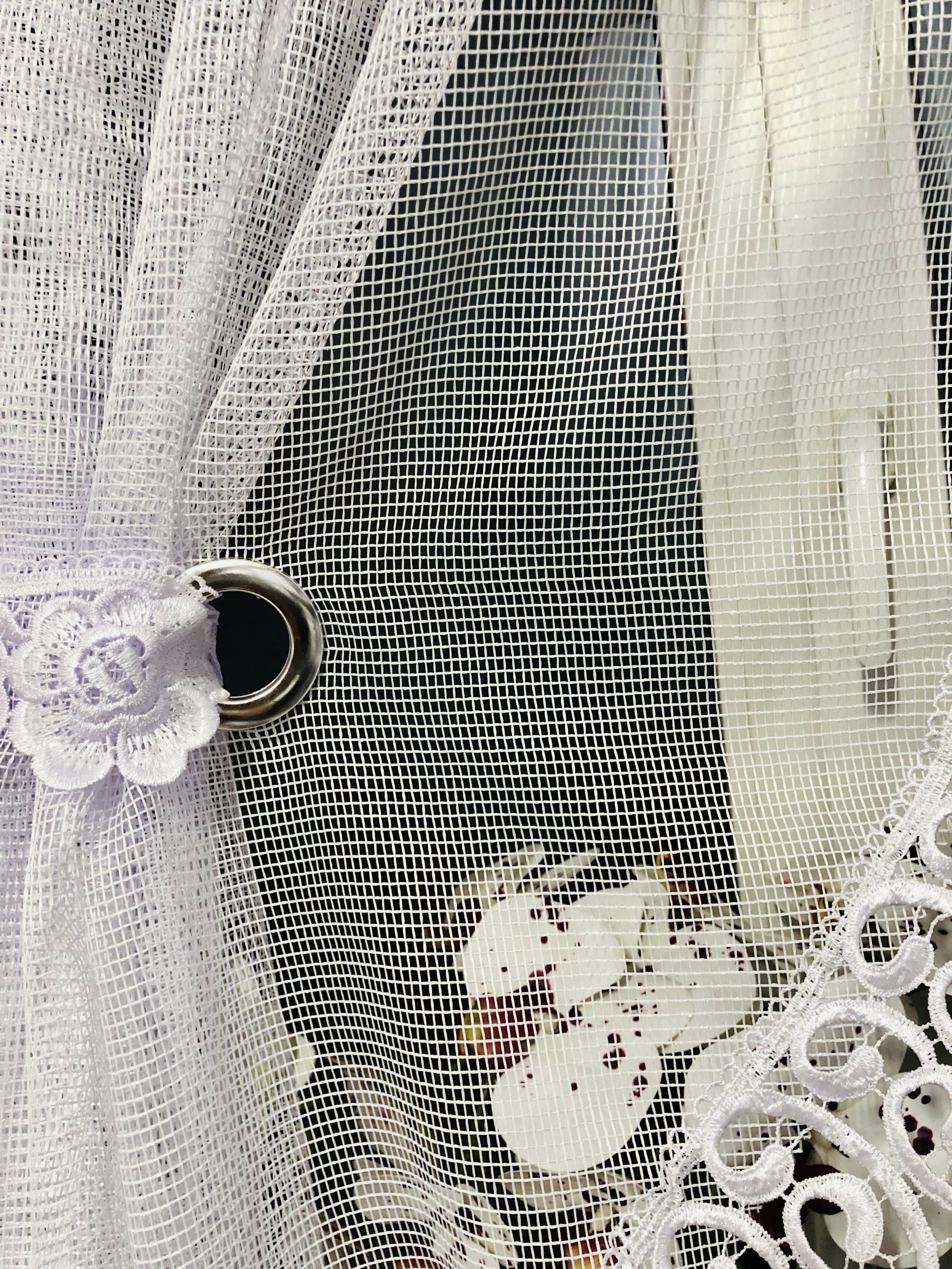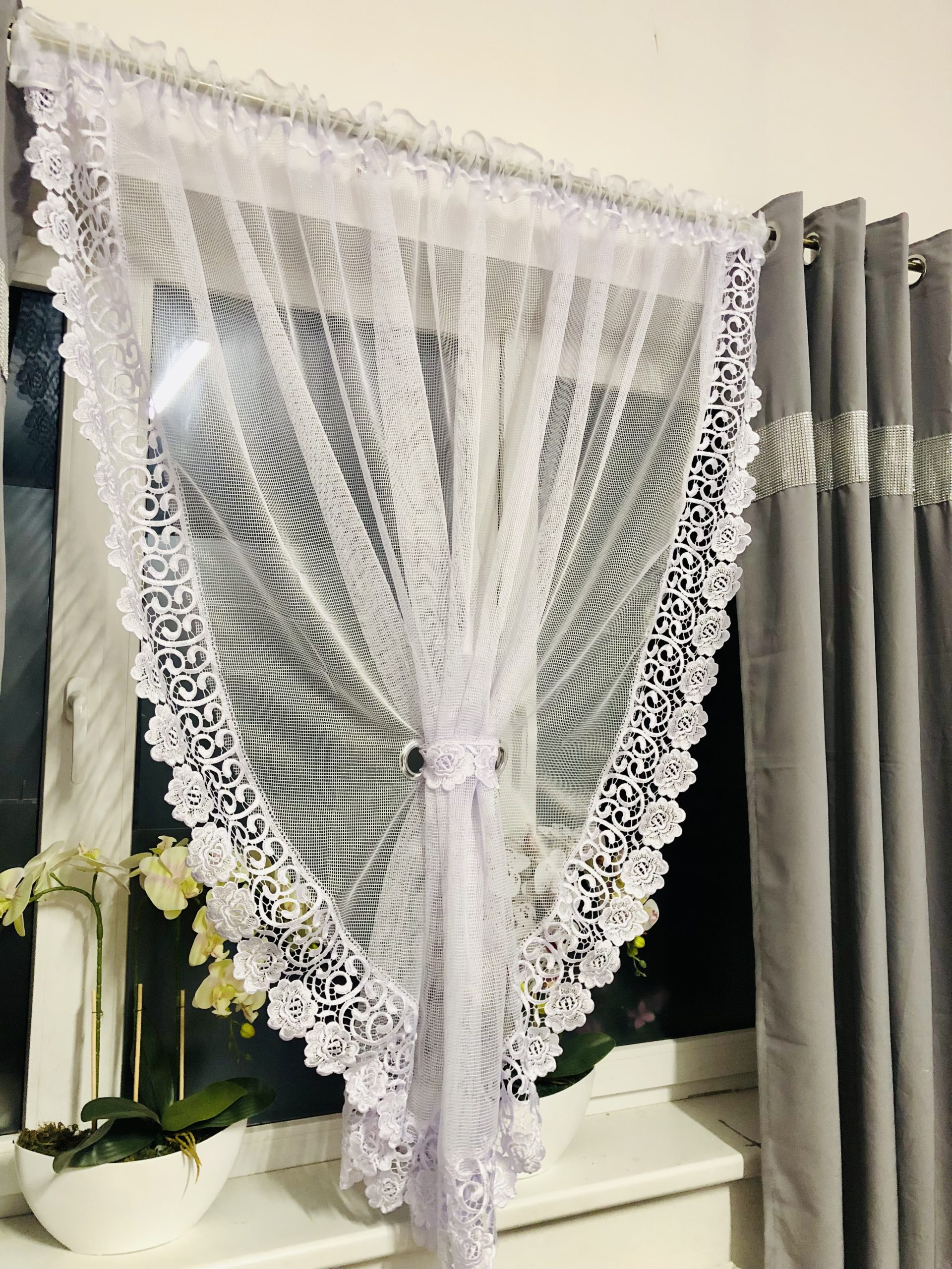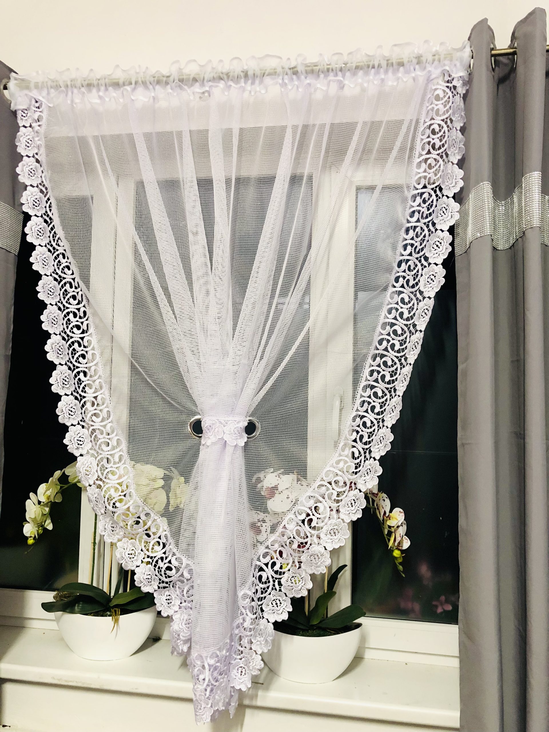Firana gotowa w biały markizeta wzorze w połączeniu z piękną ozdobną gipiurą, która doskonale ożywi Twoje wnętrze!!!