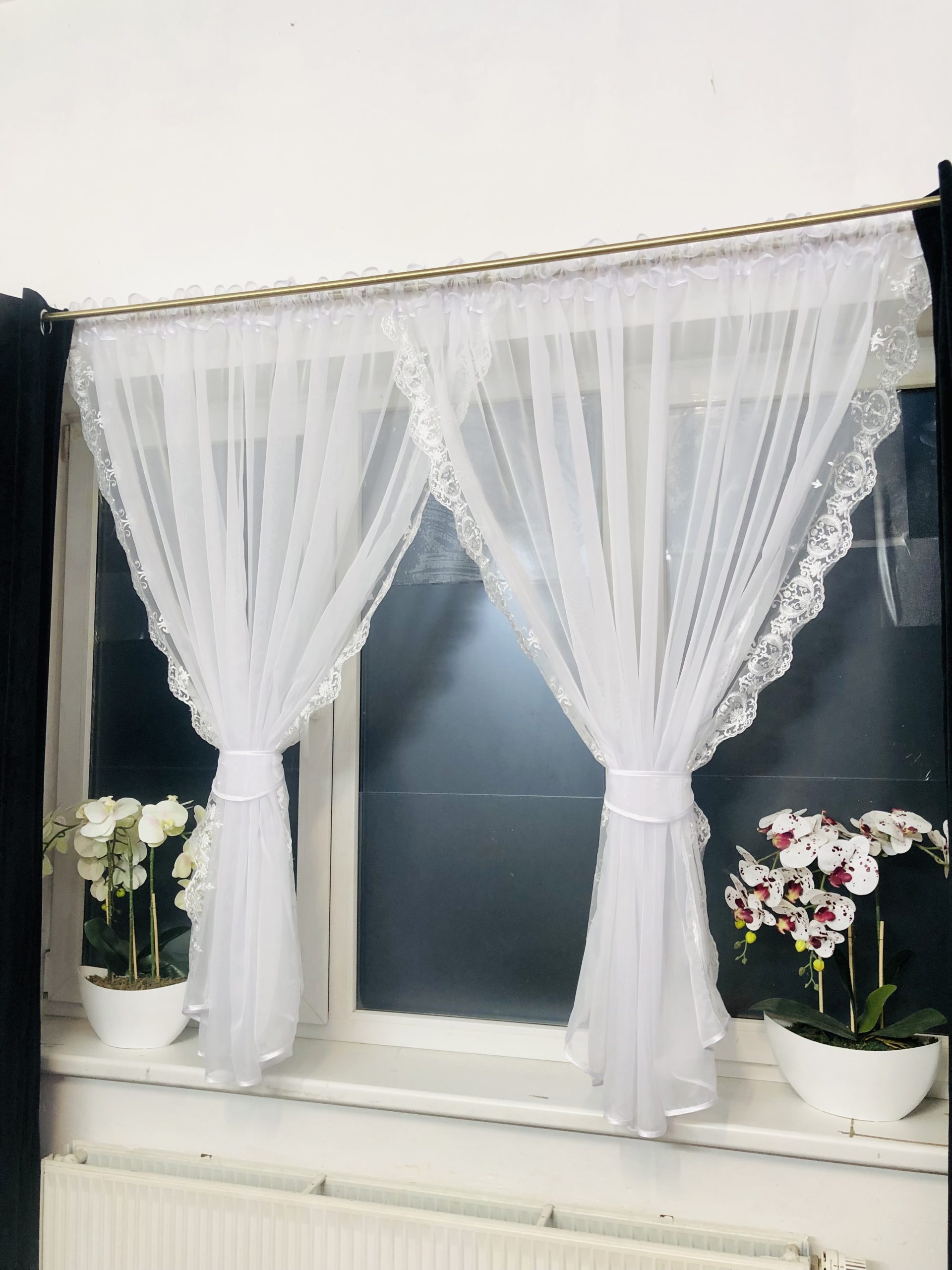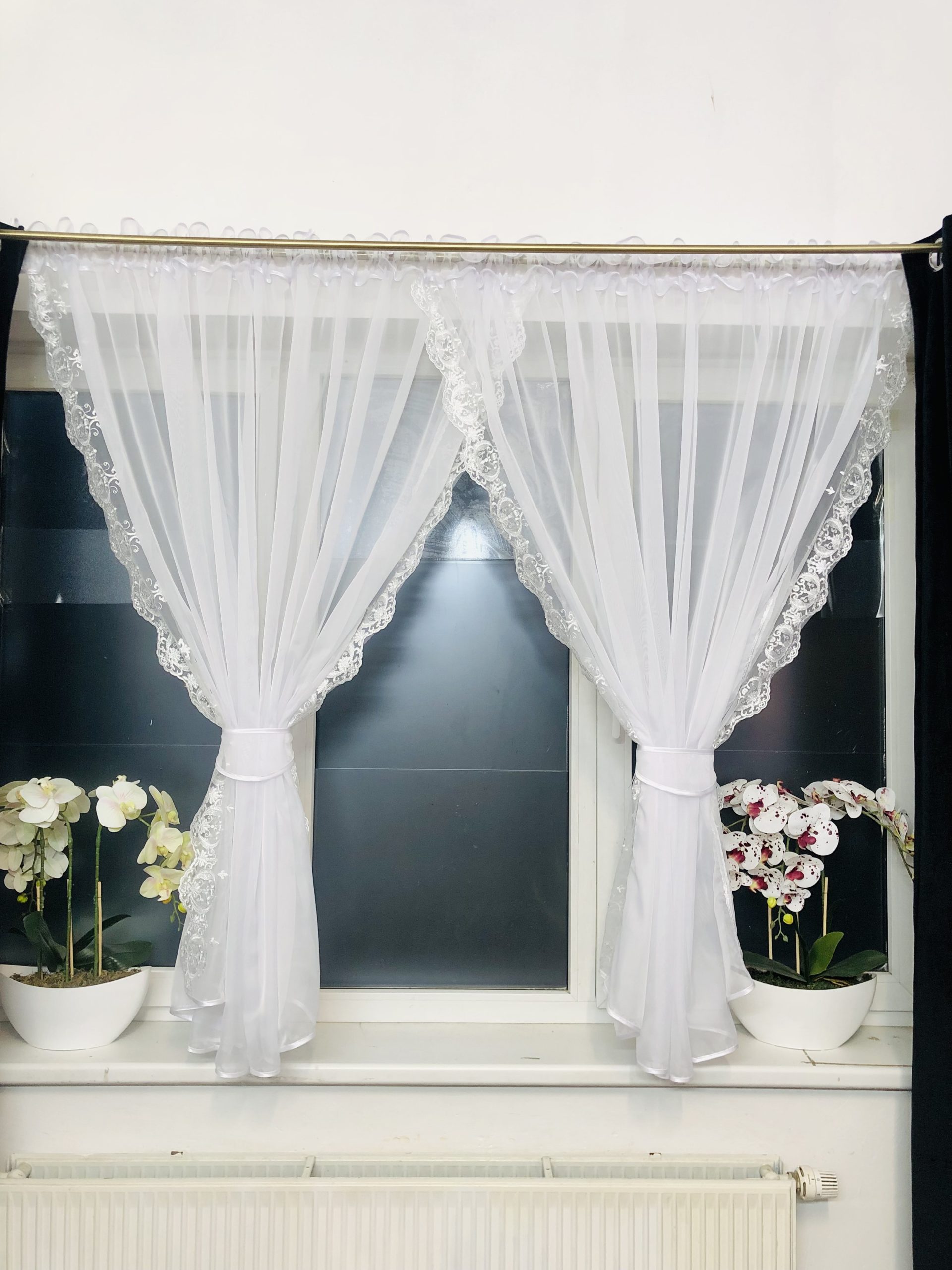 Boki firany zdobi delikatna wstawką z haftem, dodając jejuroku.