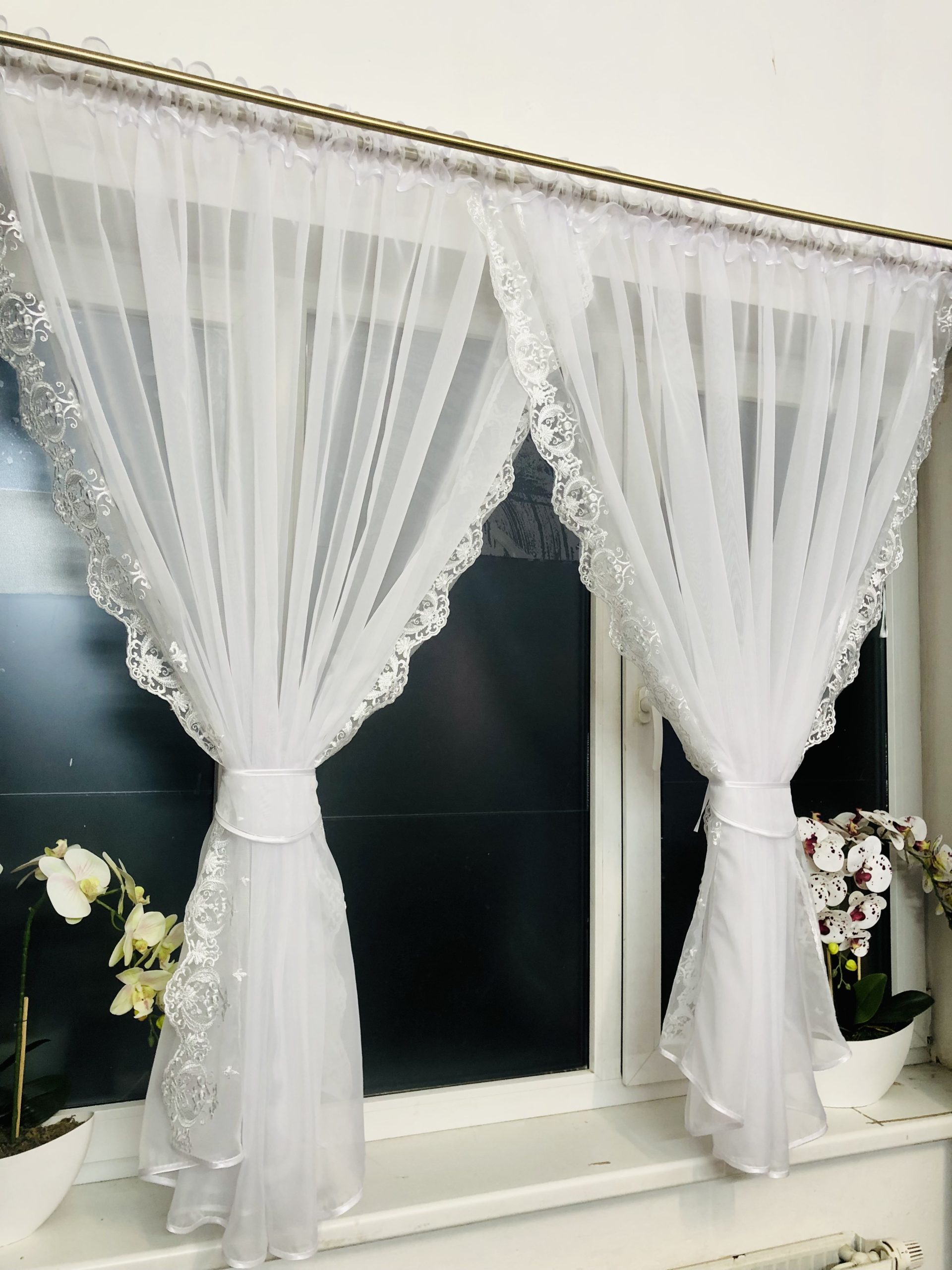 Na zdjęciu widzimy białych firany zdobionych delikatnym haftem. Firany są wykonane z woalu, który jest lekkim i przewiewnym materiałem. Haft jest wykonany w kolorze białym i przedstawia wzory kwiatowe i geometryczne