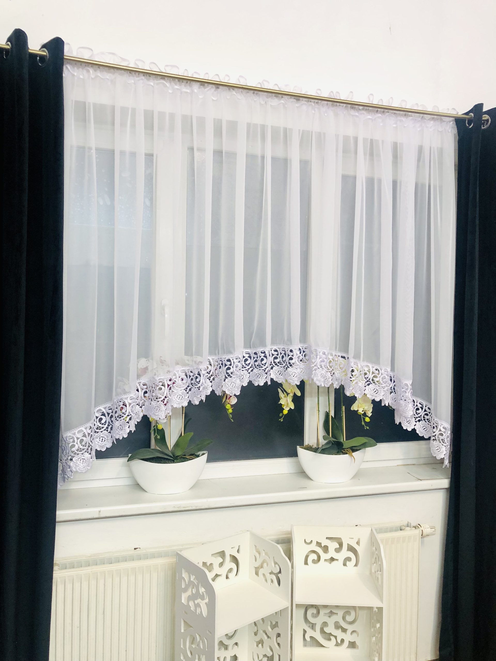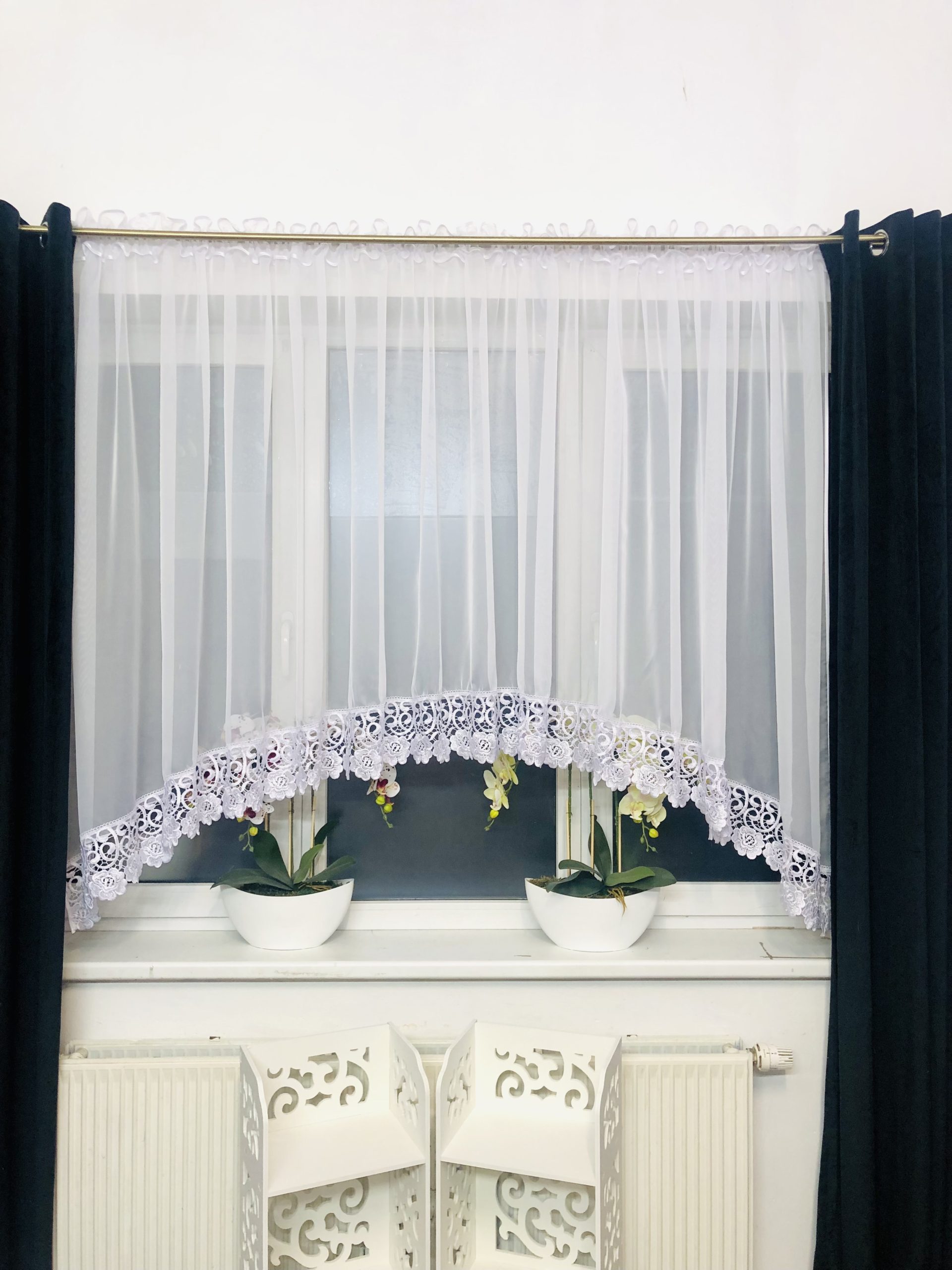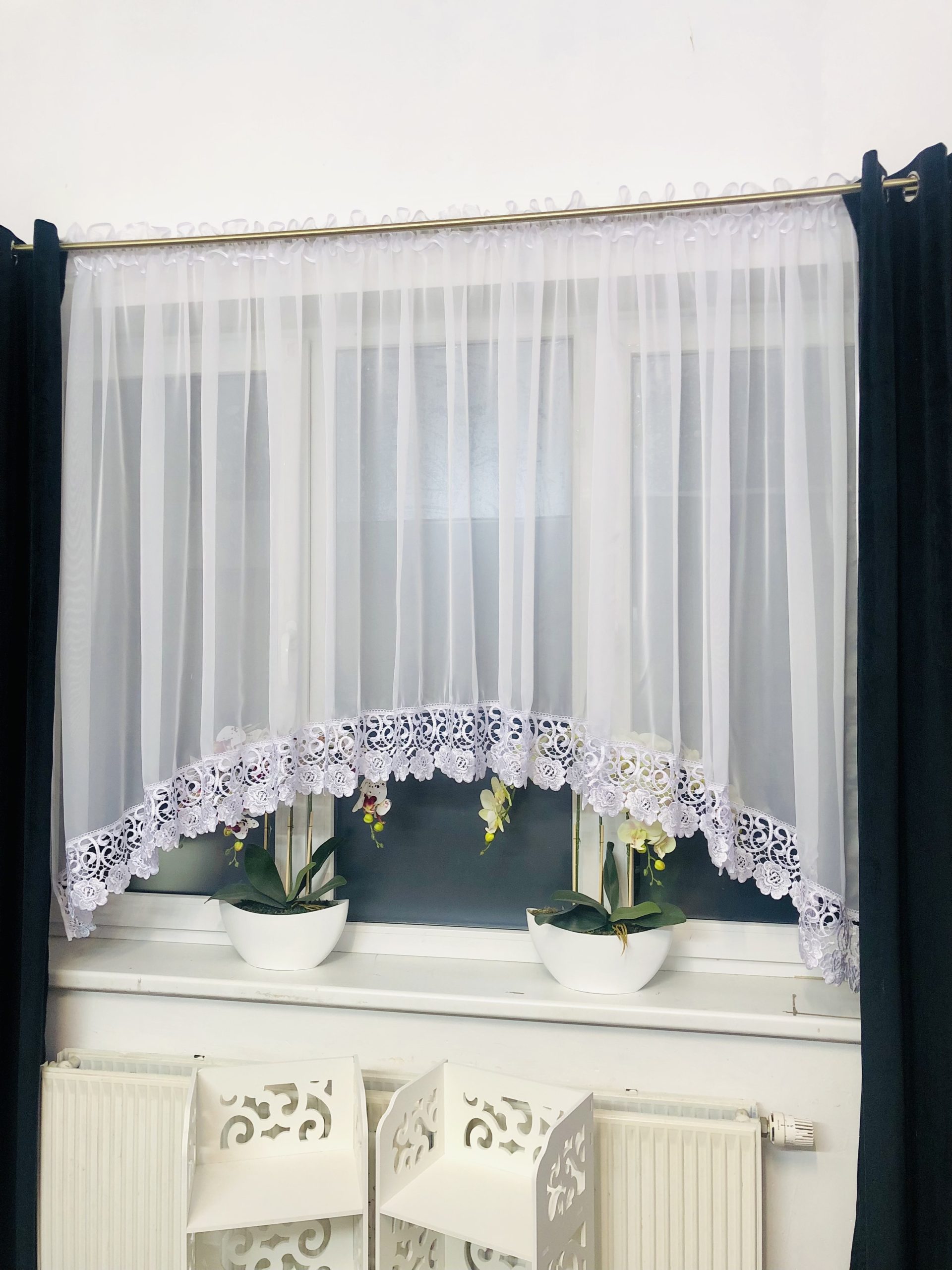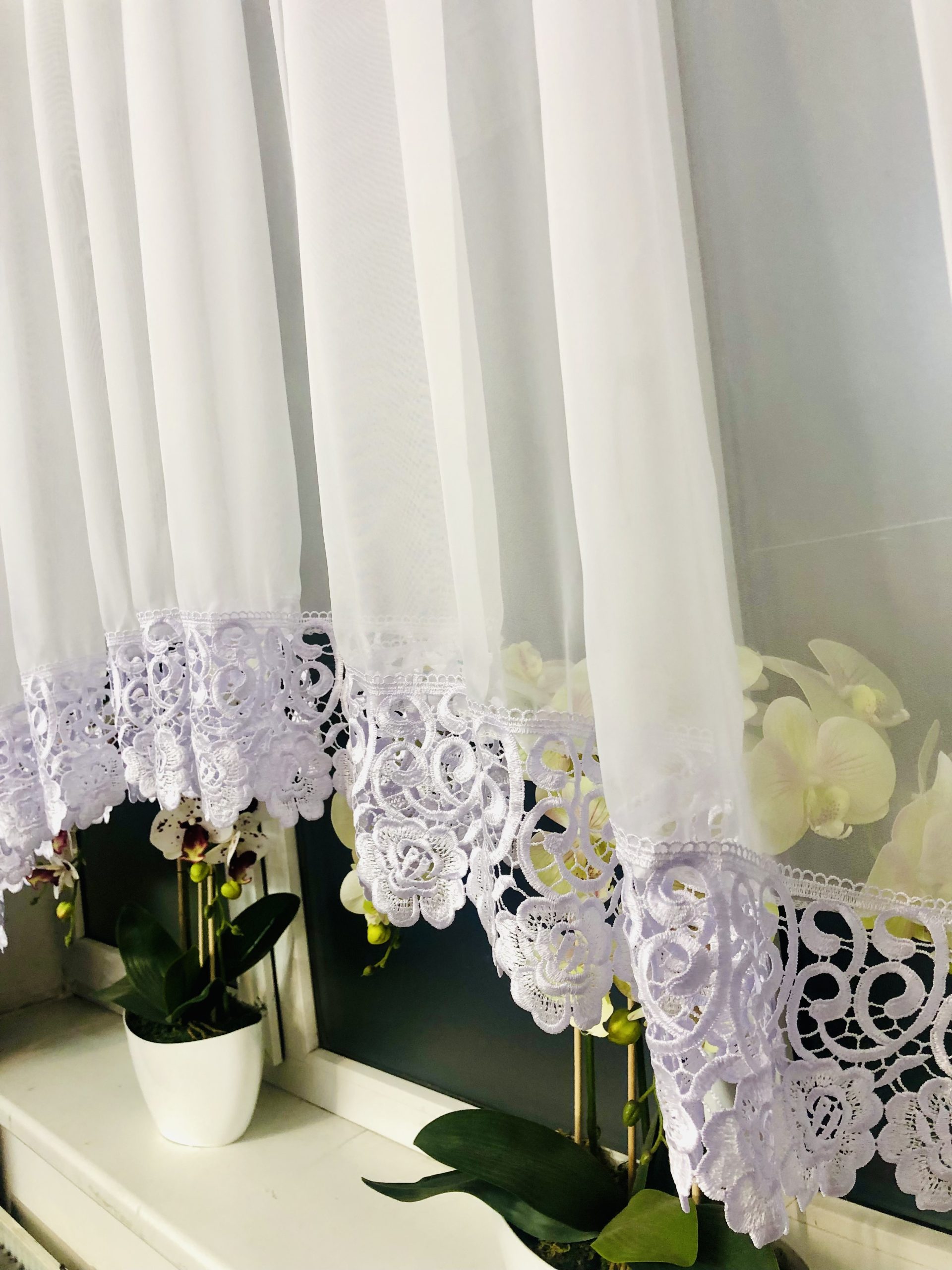 Woał jest materiałem popularnym i uniwersalnym. Firana z gipiurą uszyta z woalu i ozdobną gipiurą 15cm