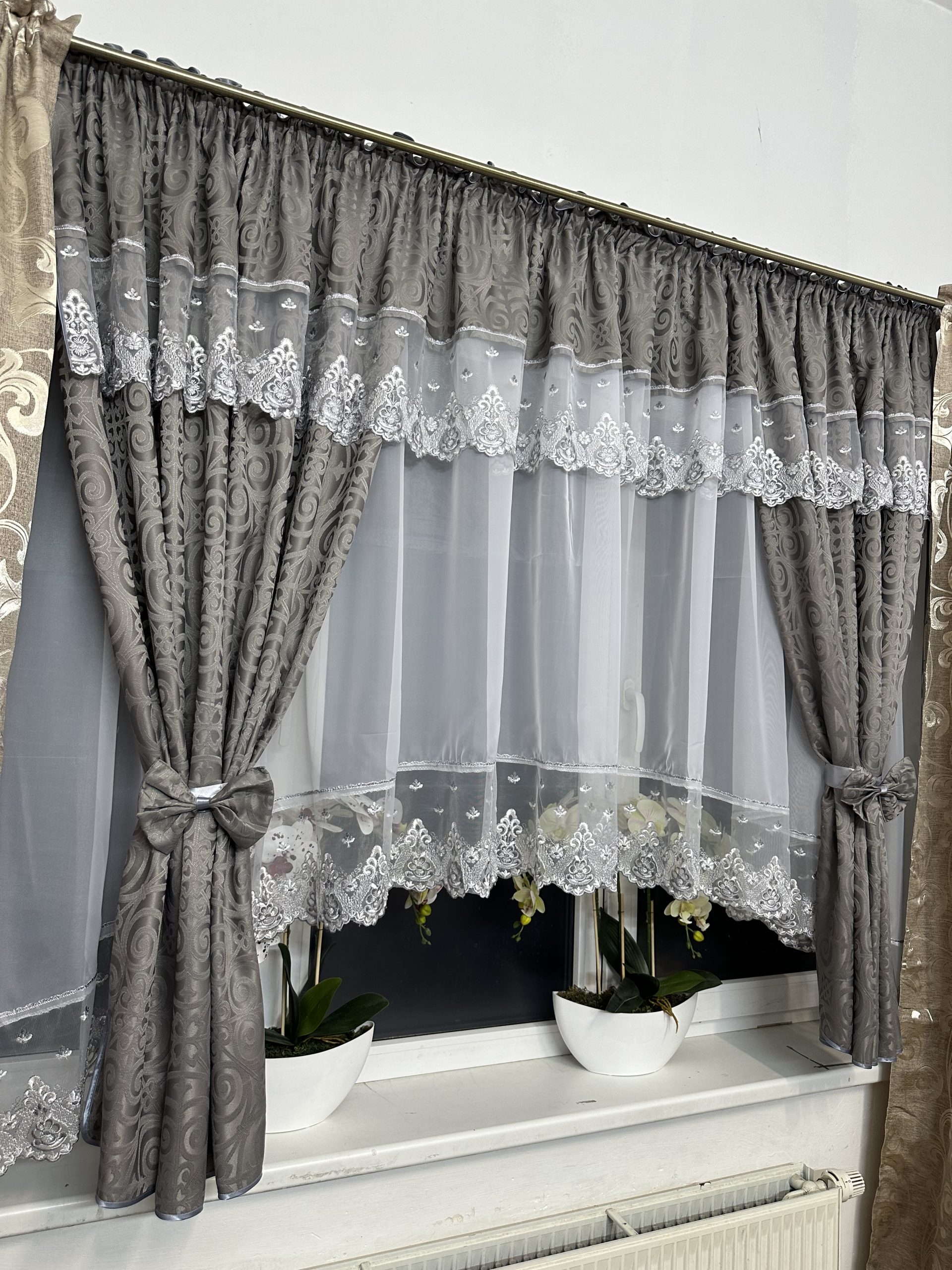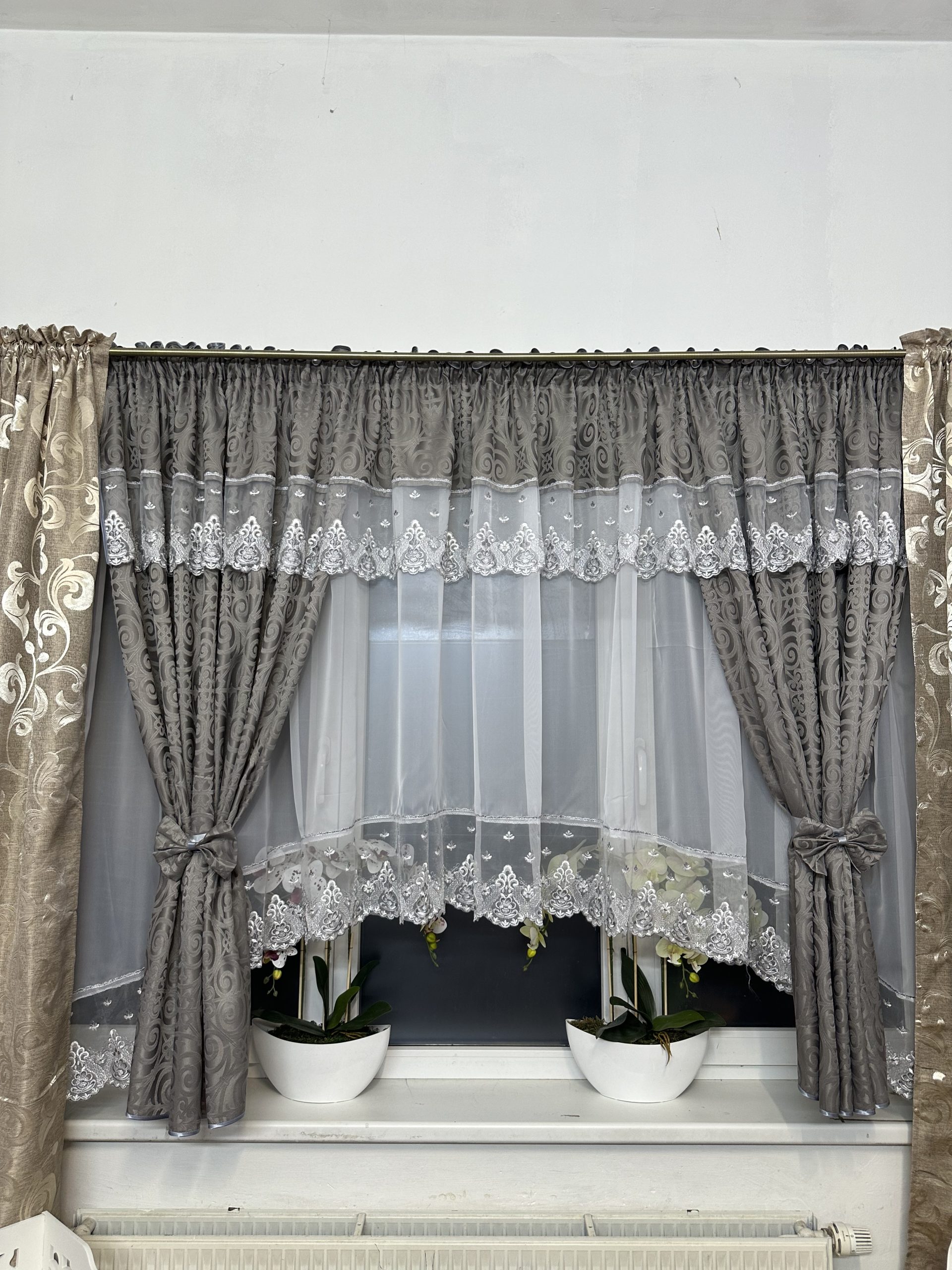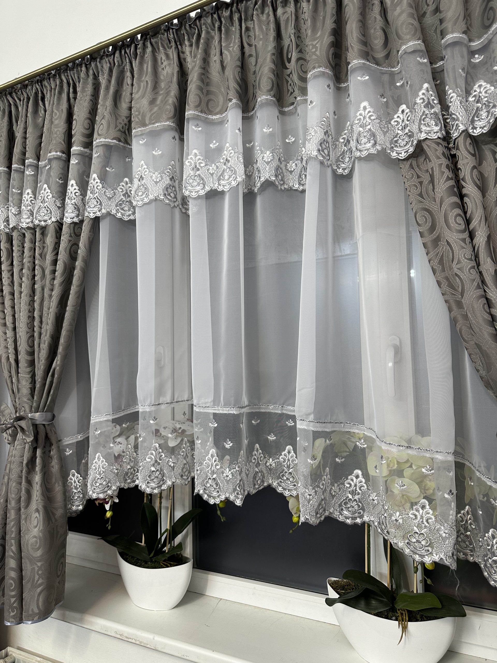 Komplet się on z 4 połączonych ze sobą części: pięknej firany, efektownego lambrekinu oraz urokliwych zasłon, wszystkie uszyte na jednej taśmie
