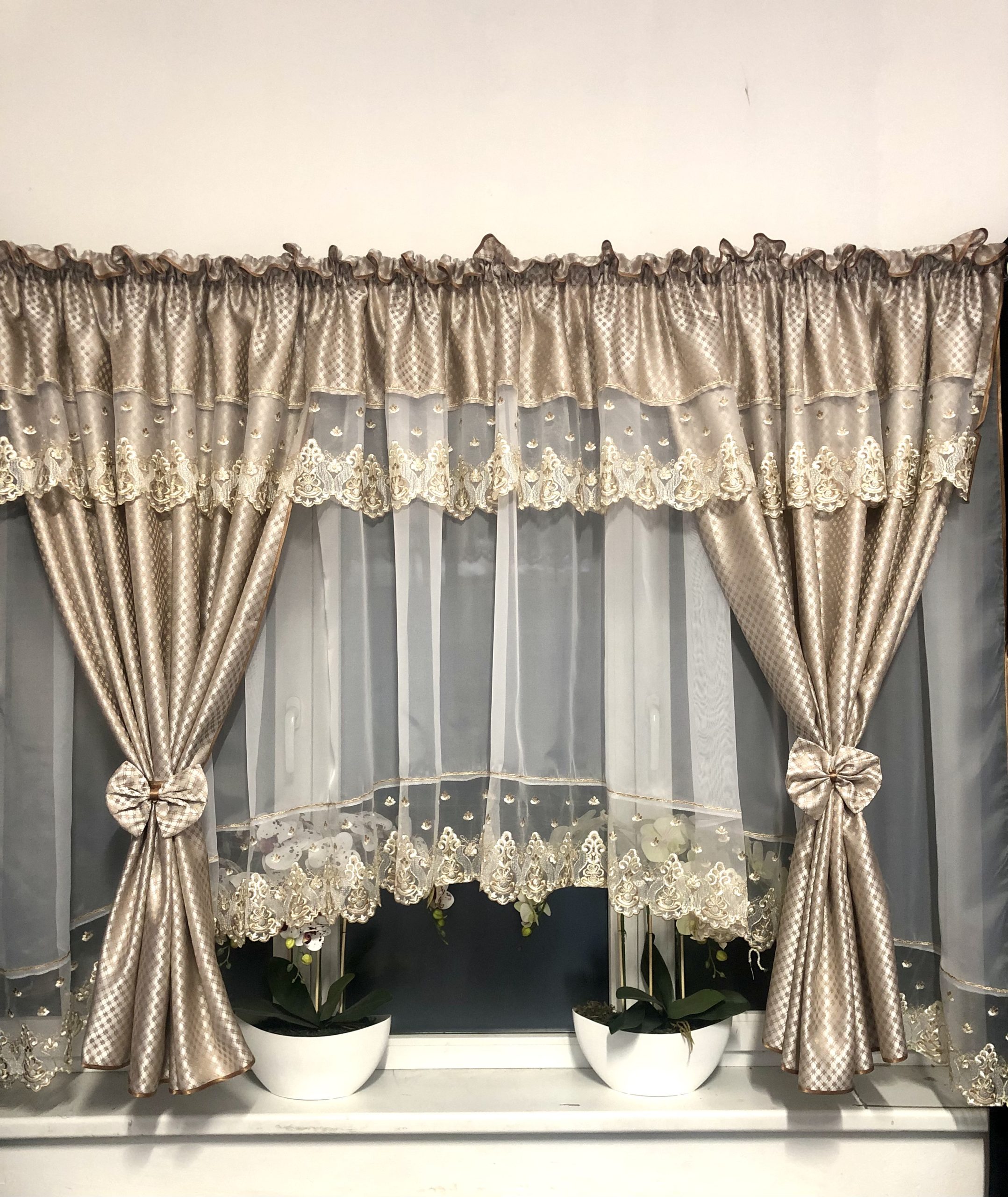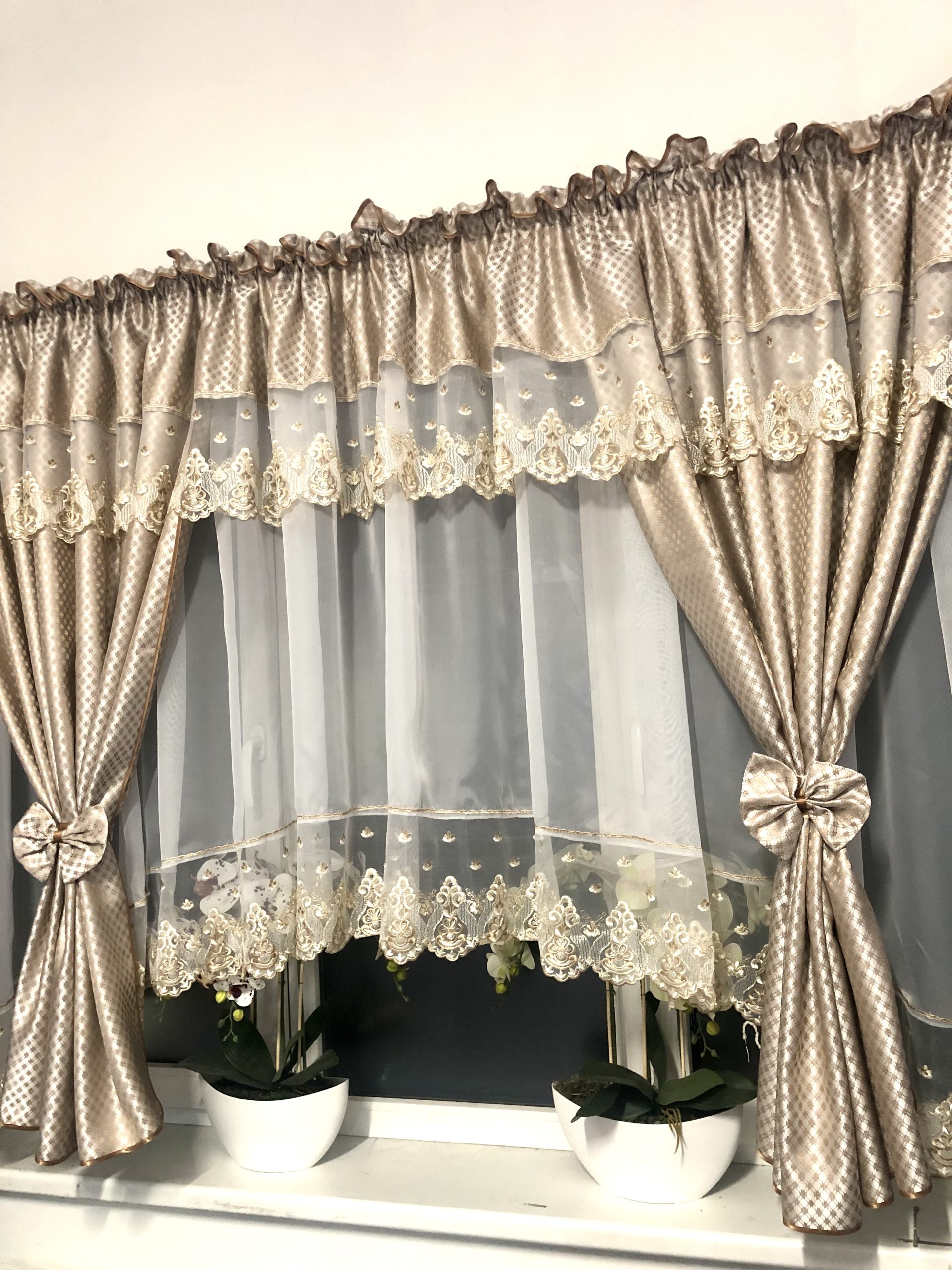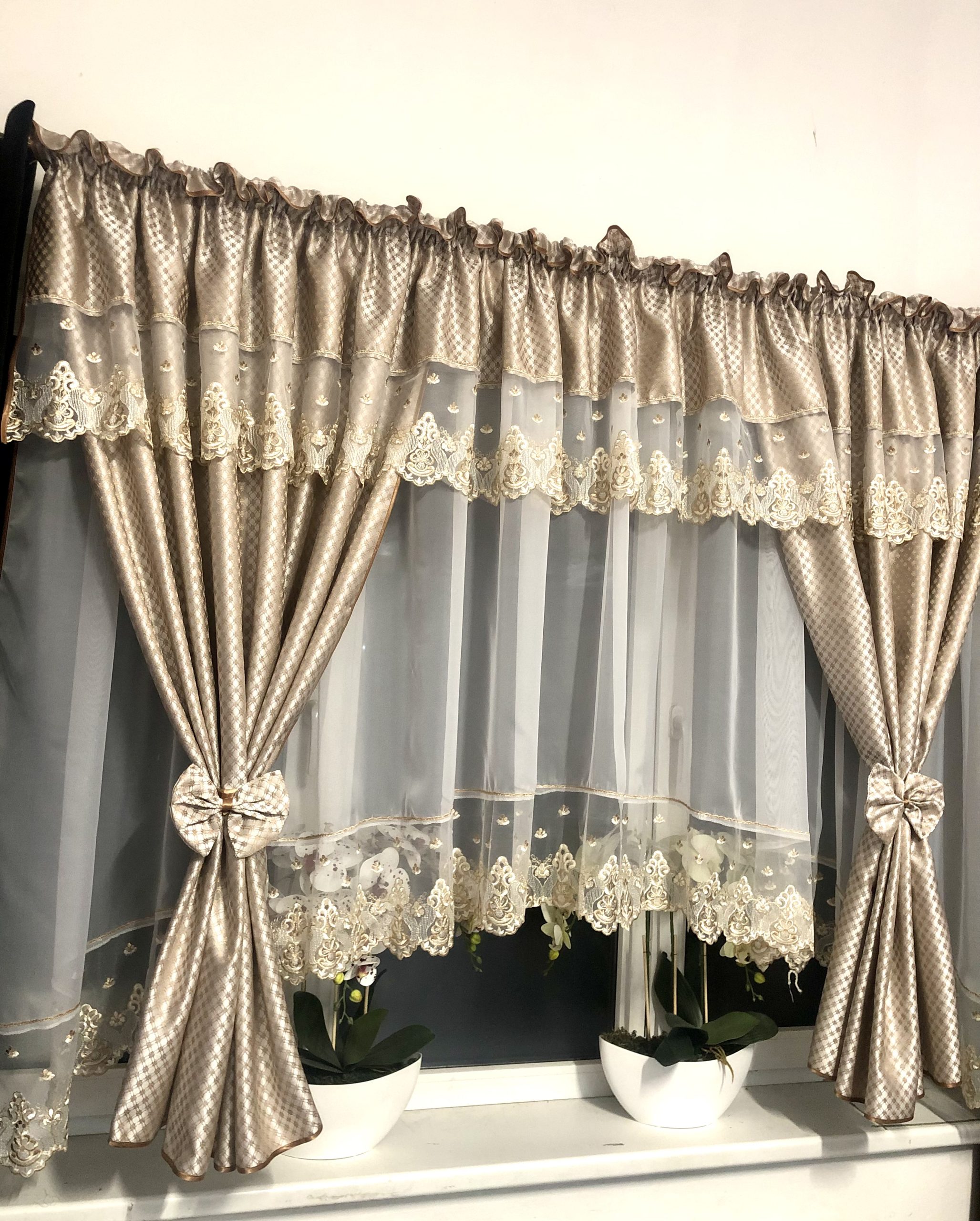 Komplet się on z 4 połączonych ze sobą części: pięknej firany, efektownego lambrekinu oraz urokliwych zasłon, wszystkie uszyte na jednej taśmie