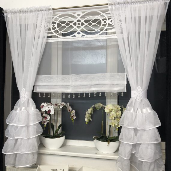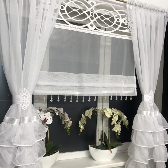 Śliczna komplet firana z białego woalu wykończona uroczymi falbanami
