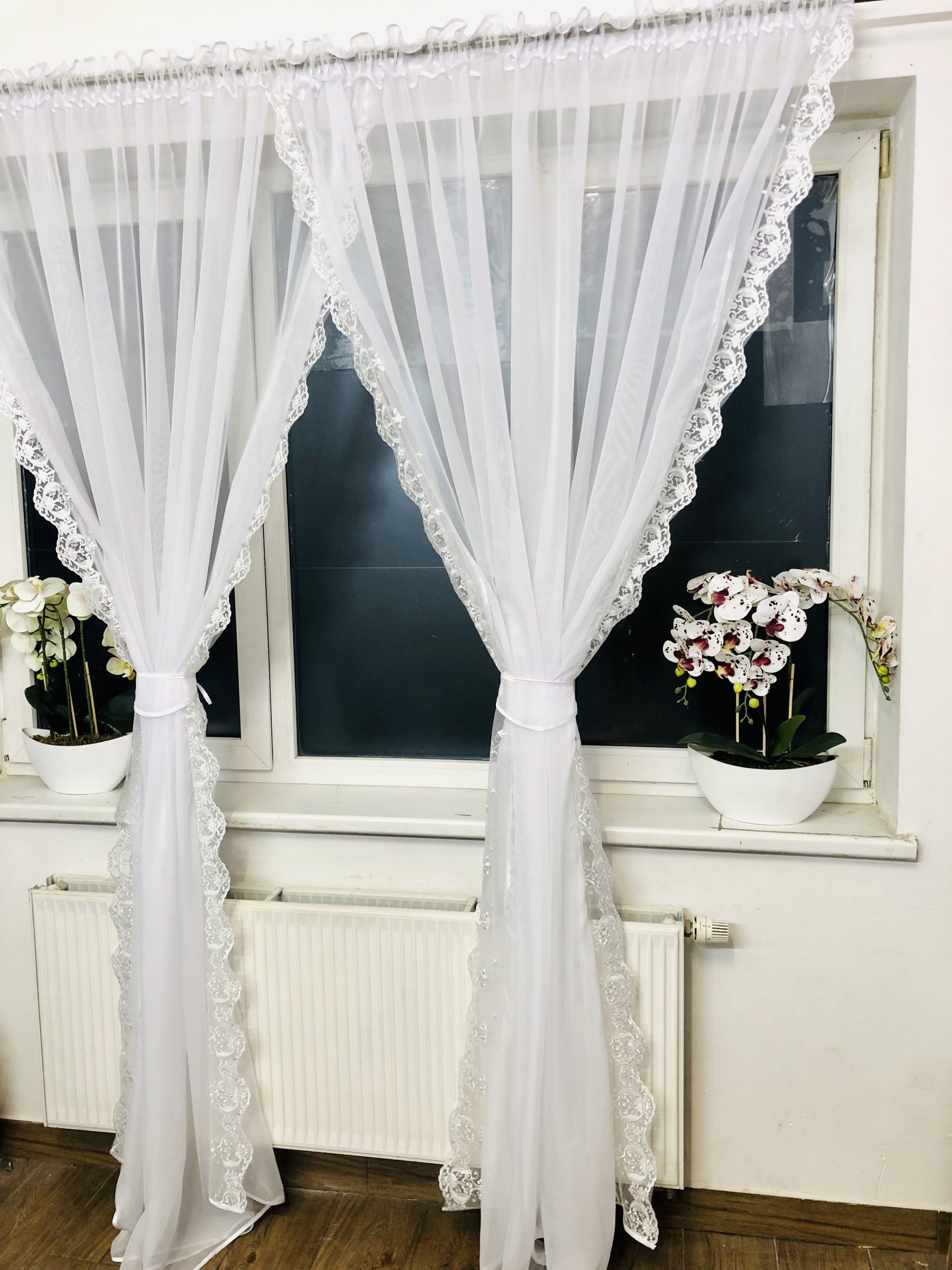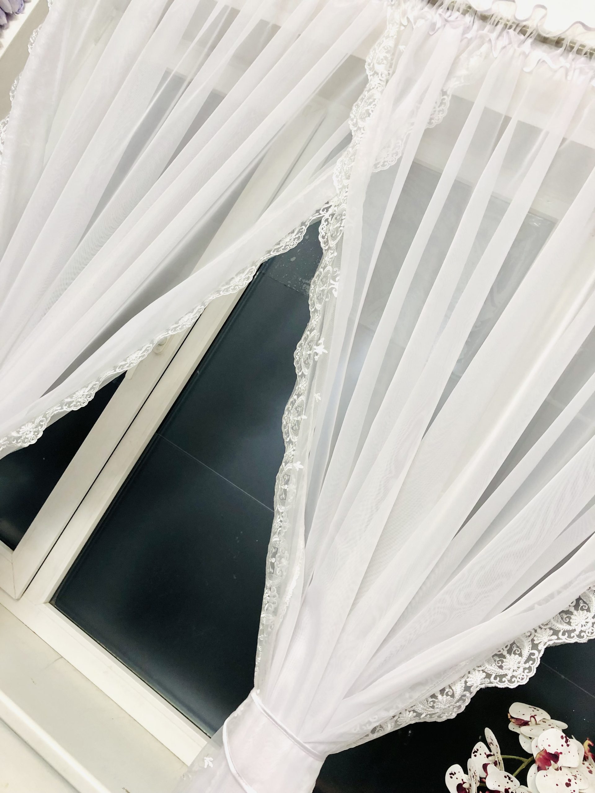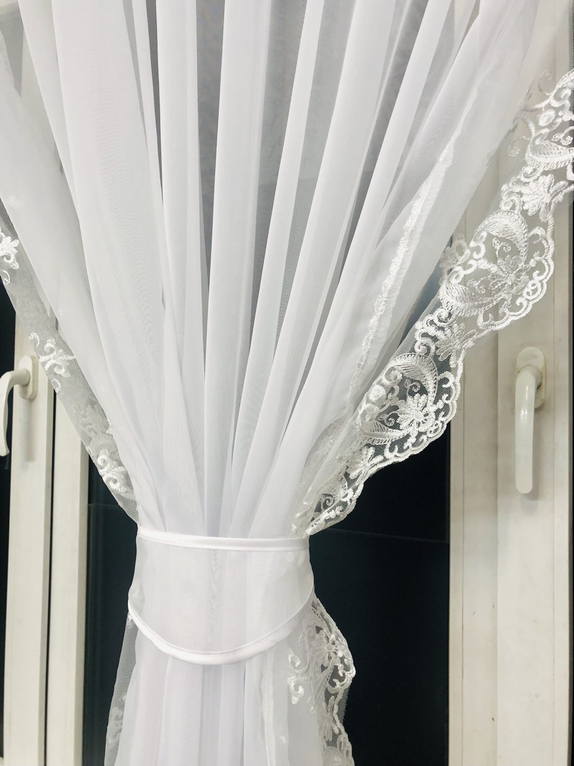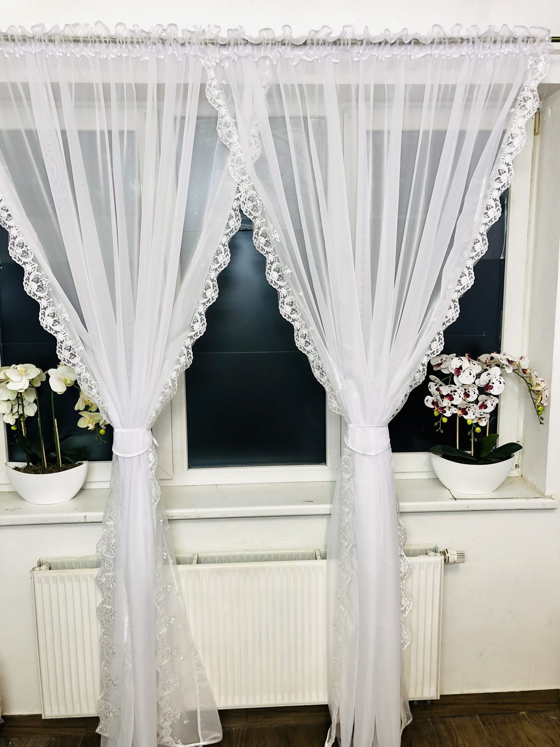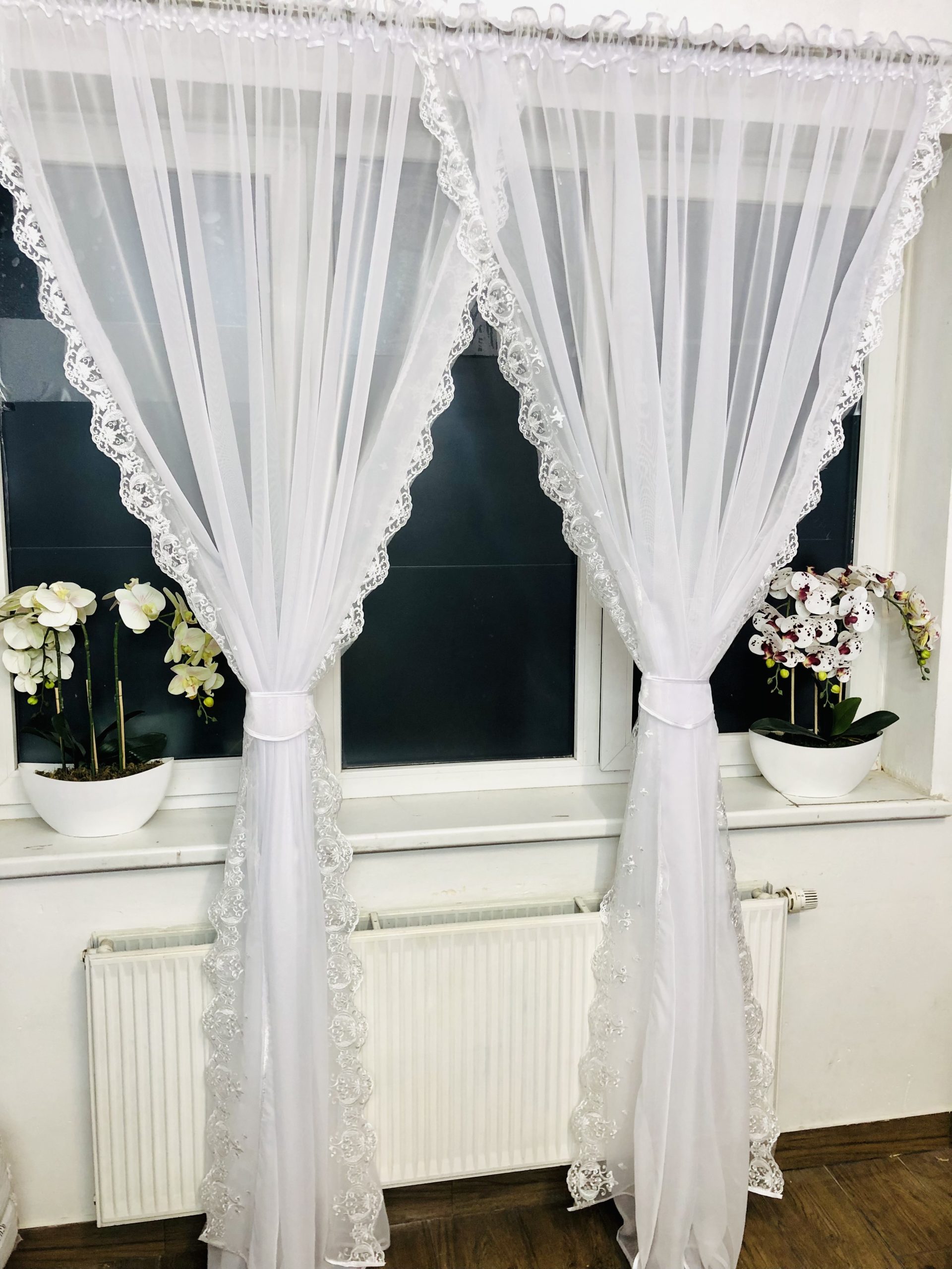 Na zdjęciu widzimy białych firany zdobionych delikatnym haftem. Firany są wykonane z woalu, który jest lekkim i przewiewnym materiałem. Haft jest wykonany w kolorze białym i przedstawia wzory kwiatowe i geometryczne