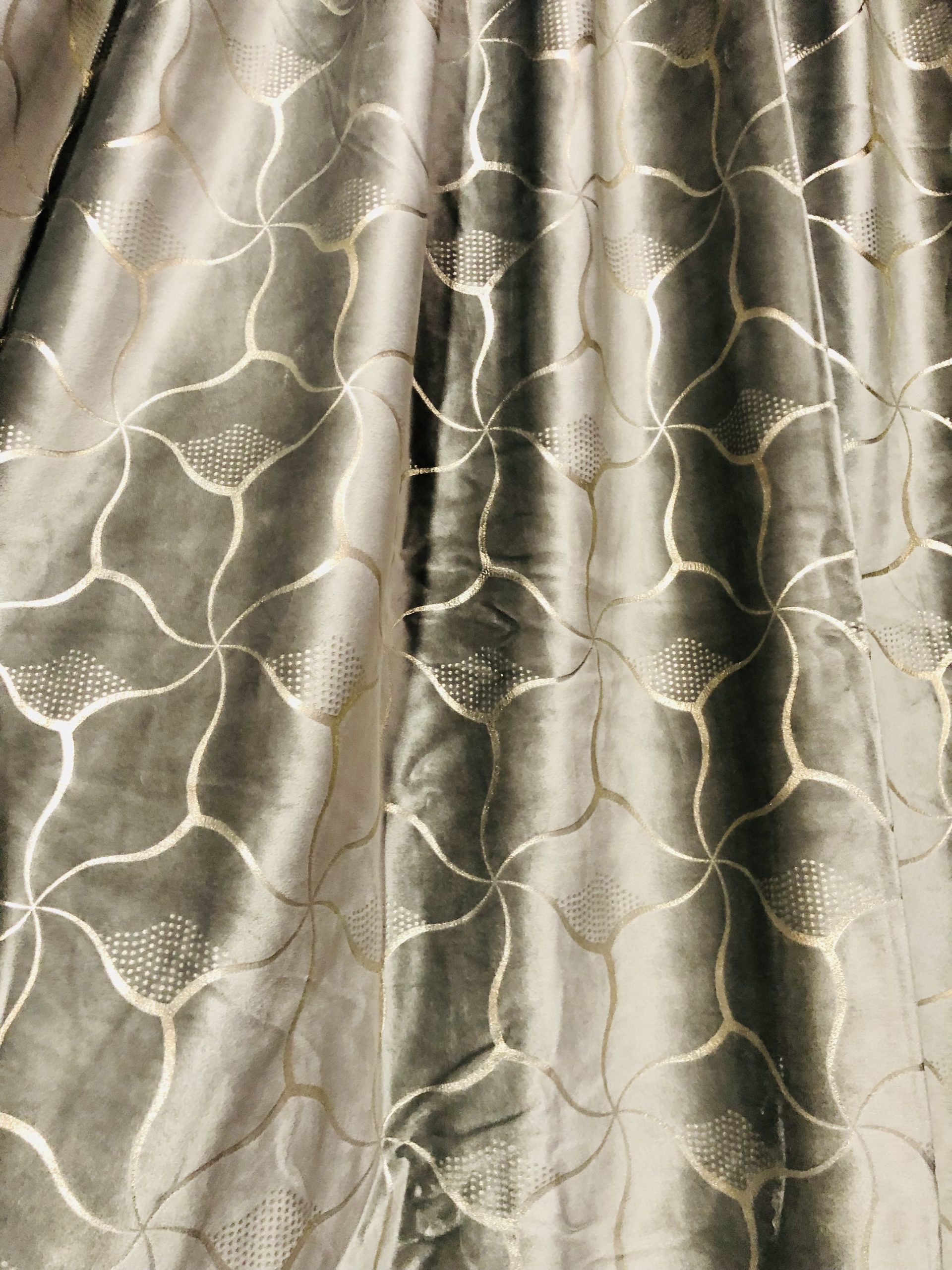 Welurowa zasłona mają niepowtarzalny szary kolor ze złotymi wzorami. Wykończony eleganckim obszyciem i dolną krawędzią. Aksamitna tkanina jest miękka w dotyku i dodaje pomieszczeniu ciepła i przytulności. Zawieszony na karniszu tworzy jednolite fale, które dodają wnętrzu elegancji i luksusu. Matowy welur skutecznie zaciemnia pomieszczenie, chroniąc prywatność, a jednocześnie nie wpuszczając zbyt dużo światła