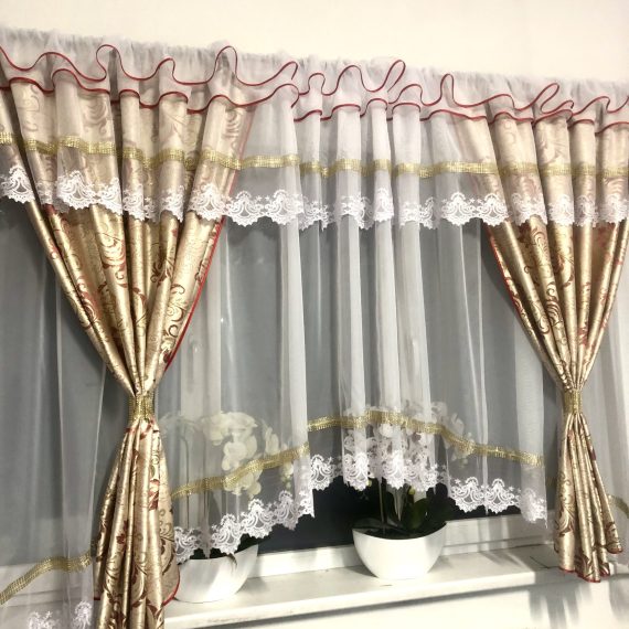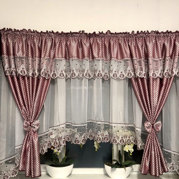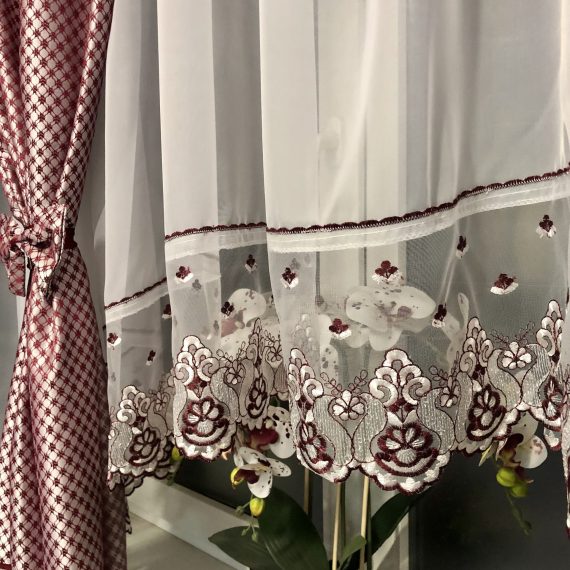 Komplet firana dekoracja z modnym haftem gipiurą z karo wzór – bordowa