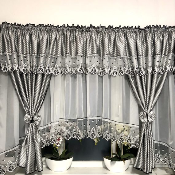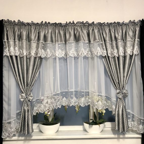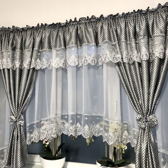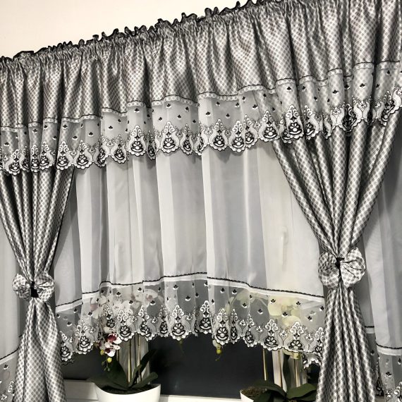 Komplet firana dekoracja z modnym haftem gipiurą z karo wzór – szara
