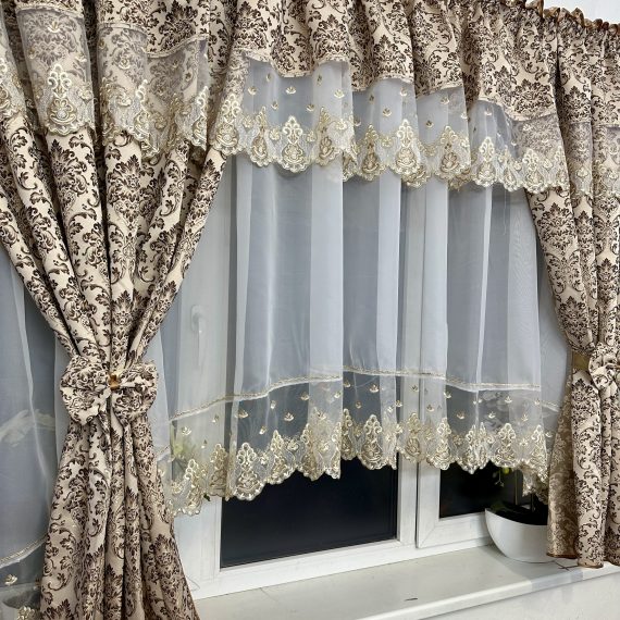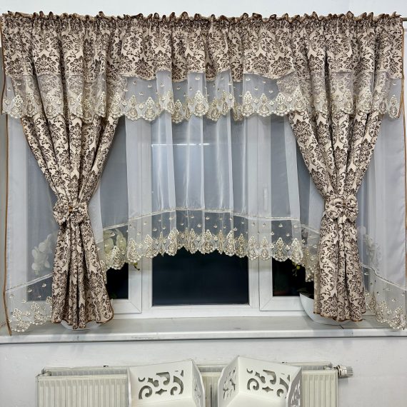 Komplet firana dekoracja z modnym haftem gipiurą – brązowy