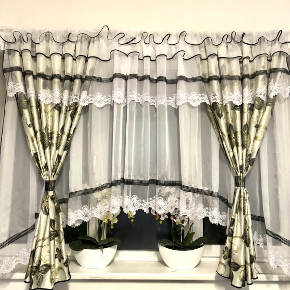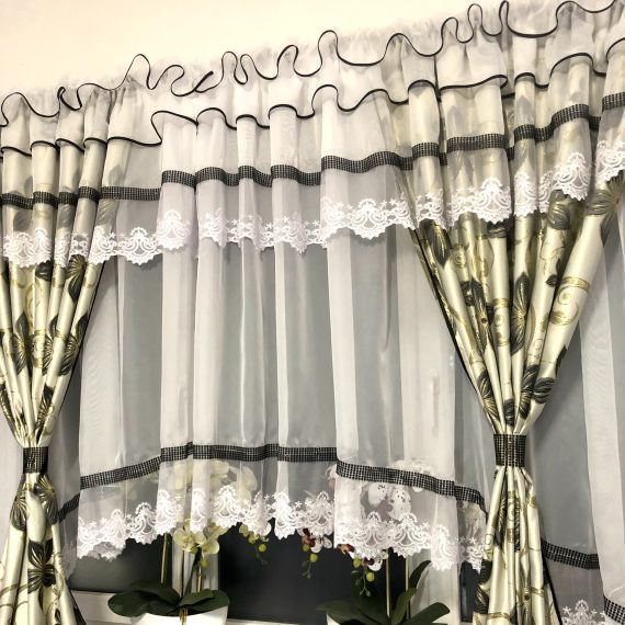 Komplet firana dekoracja z modnym haftem gipiurą z karo wzór – czarna
